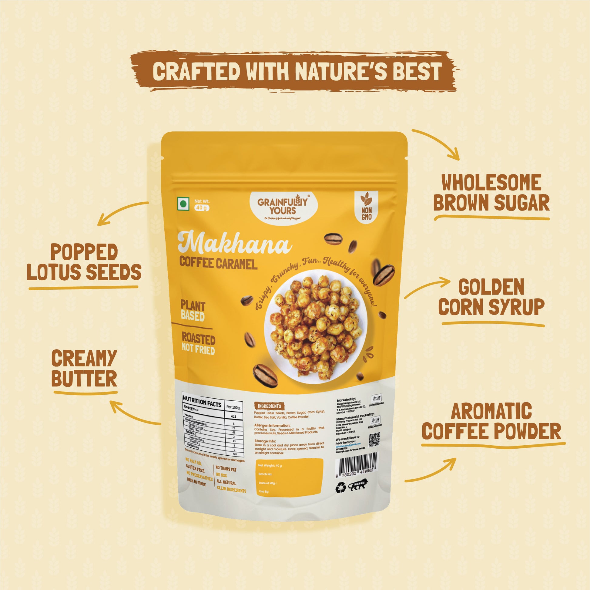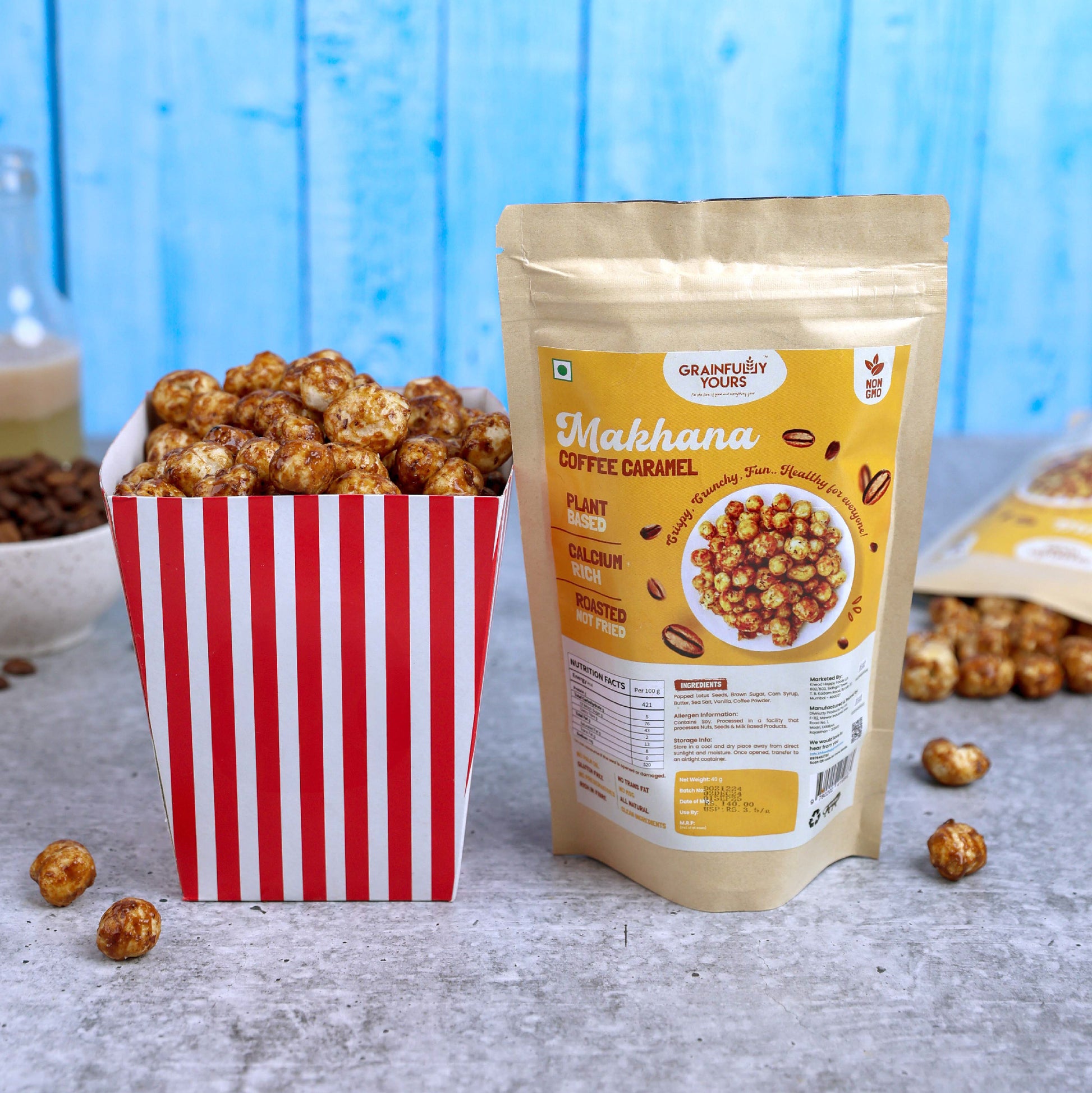 Our Coffee Caramel Makhana is a perfect fusion of rich, aromatic coffee and the natural crunch of roasted makhana (fox nuts), coated in smooth, indulgent caramel glaze.