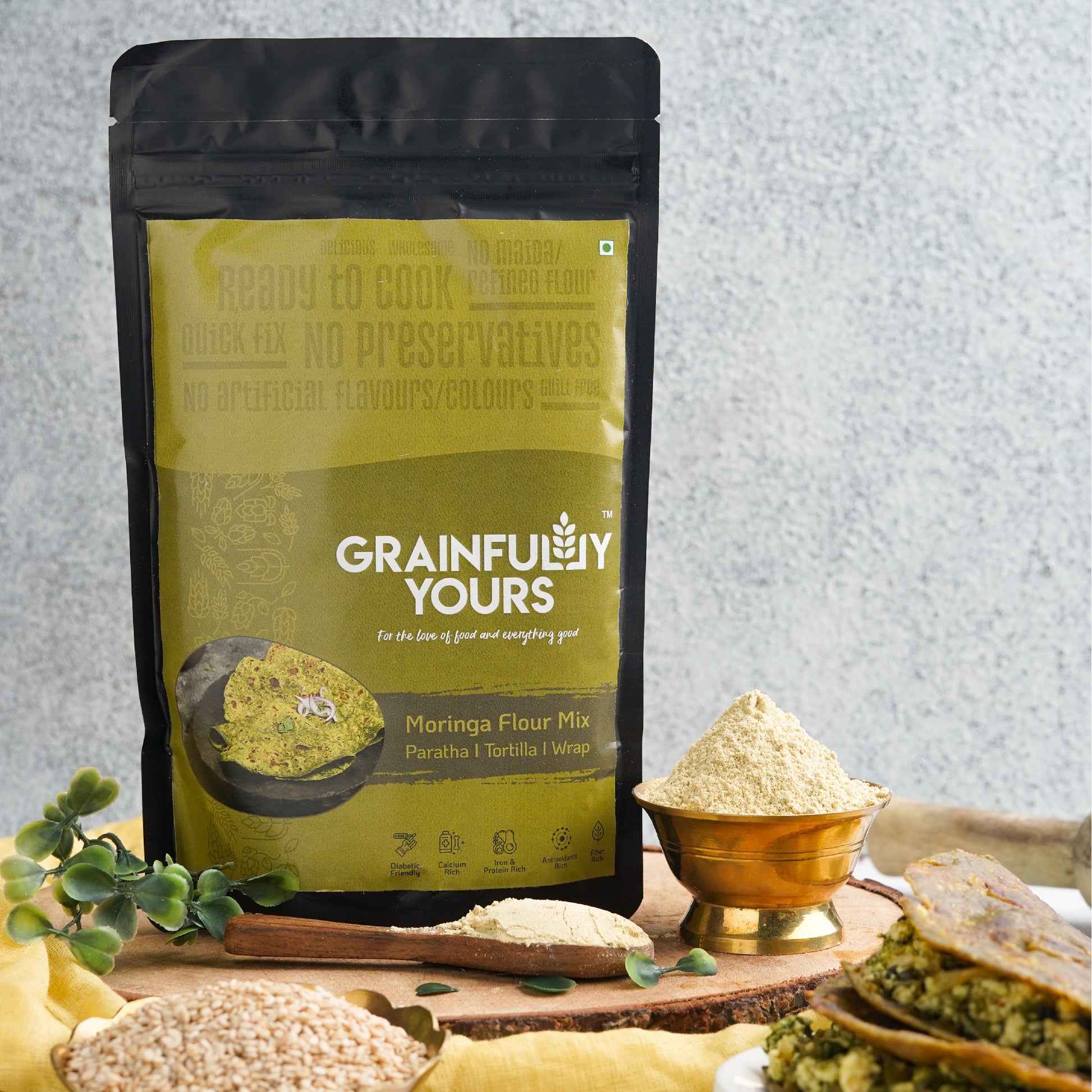 - Take Grainfully Yours Moringa Flour Mix and add 2 tbsp oil